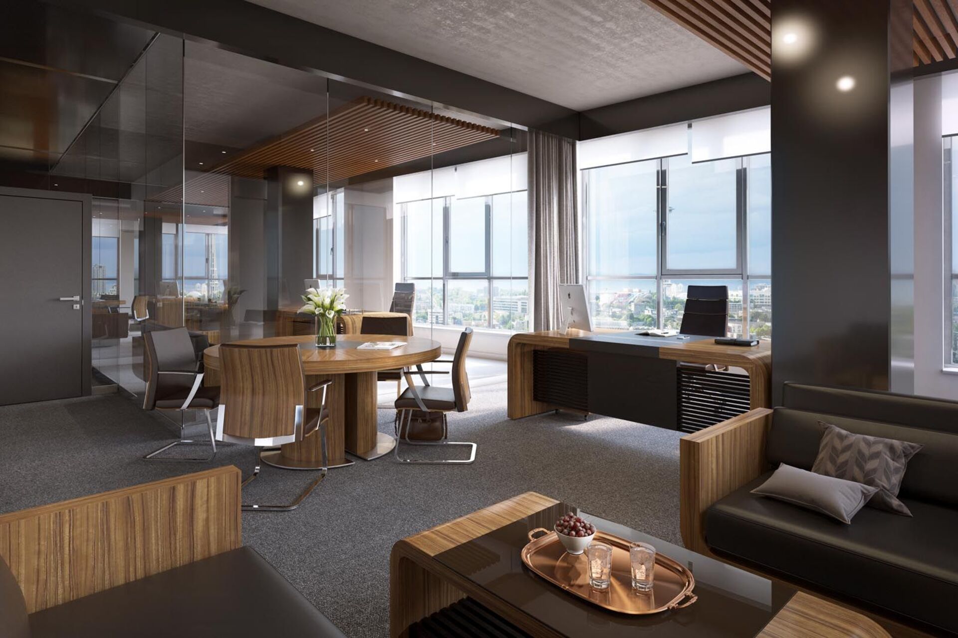2. необычная форма мебели за счет закругленных углов письменных столов, брифингов, журнальных столиков;