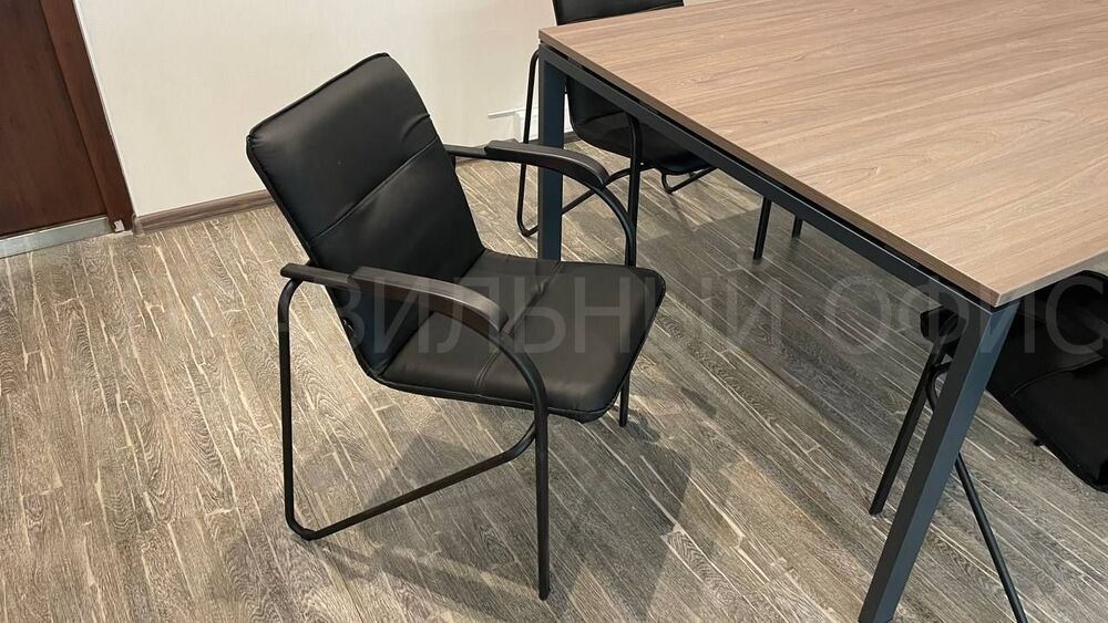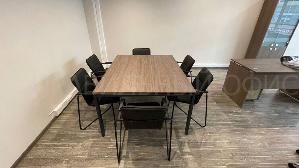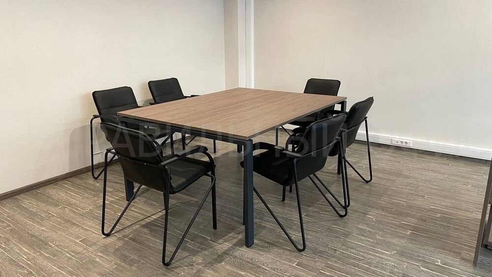 В зоне для переговоров был установлен переговорной стол из серии Metal System Direct на П-образном металлокаркасе в цвете Вяз Благородный/Антрацит.